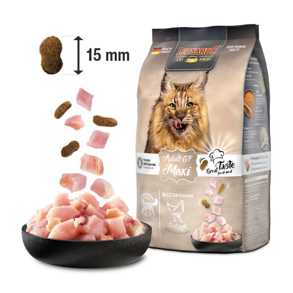 Hrana Super Premium LEONARDO® GF Maxi este special concepută pentru pisicile de talie mare, precum Maine Coon sau pisica norvegiană de pădure. Produsă în Germania de compania BEWITAL, această formulă fără cereale oferă o nutriție completă și echilibrată, adaptată nevoilor pisicilor adulte. Crochetele extra-mari ajută la o masticație corectă, mențin igiena dentară și sprijină digestia sănătoasă.