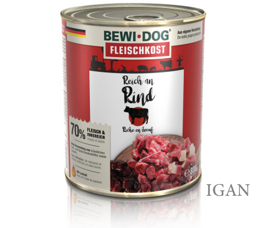 BEWI DOG Reich an Rind 800 г — премиум влажный корм для собак с сочной говядиной и субпродуктами, плотной структурой мяса и омега-3 из лососевого масла. Без зерновых, с витаминами и минералами, обеспечивает полноценное и сбалансированное питание. Идеален для ежедневного кормления взрослых собак, вкусный и легко усвояемый.